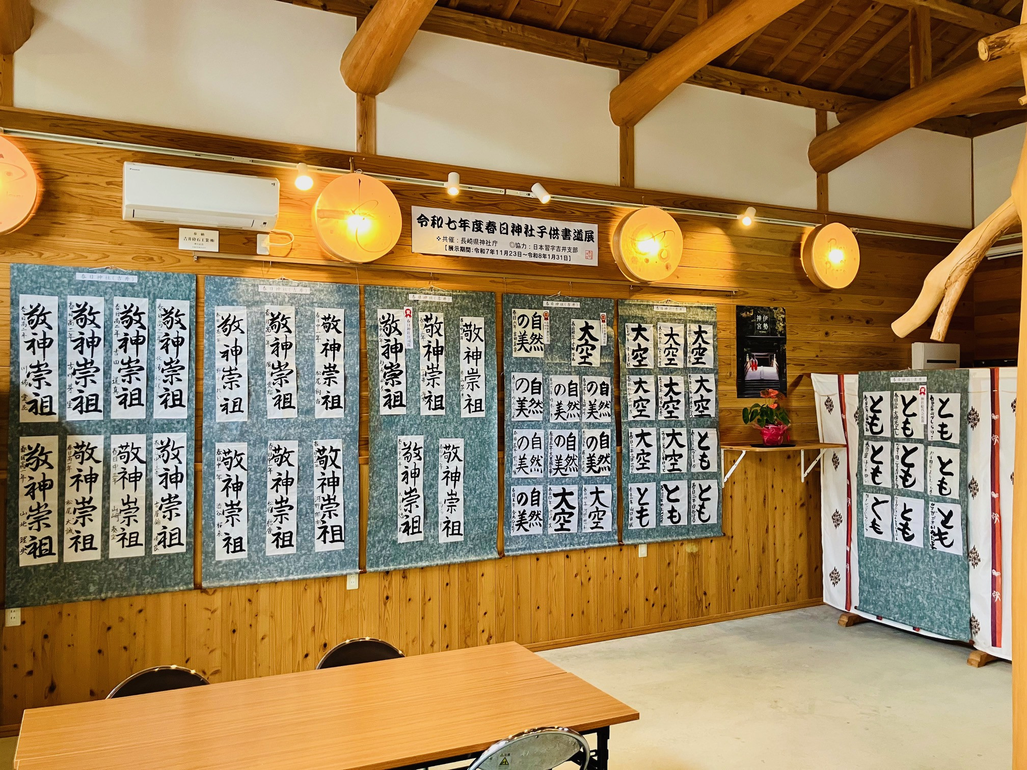 令和7年度春日神社子供書道展(共催:長崎県神社庁、協力:日本習字吉井支部)を令和記念交流館「はる日の木」(入館自由。毎日午前9時開館、午後5時閉館)で開催します。展示期間は11月月23日~令和8年1月31日まで。ご参拝の折は是非お立ち寄りください。